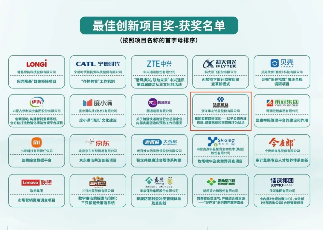 2023年8月3日,,,,,第二届“民营企业清廉合规立异奖”在华东政法大学长宁校区举行颁奖盛典,,,,,金沙js93252钴业监察网格深化项目荣获“最佳立异项目奖”奖项。。