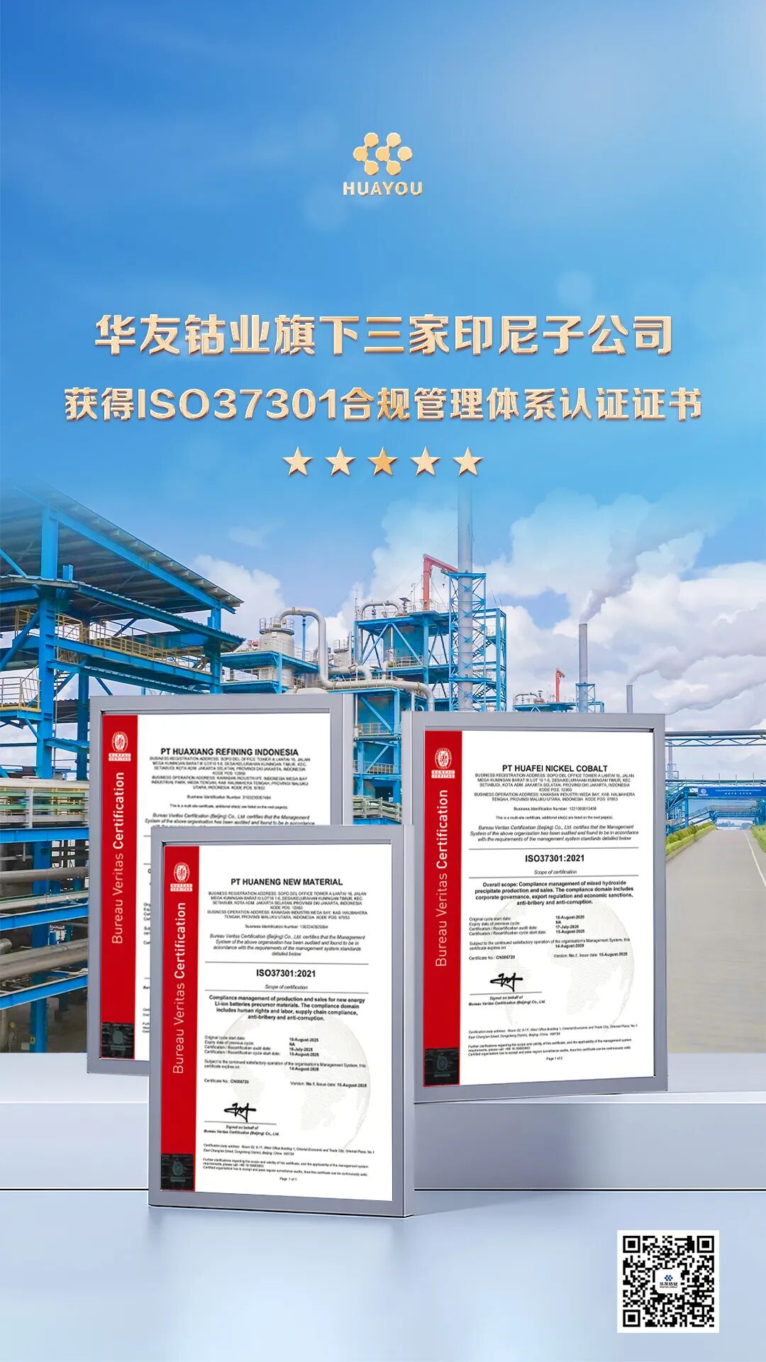 9月12日 ,,,,金沙js93252钴业旗下三家印尼子公司——华飞镍钴(印尼)有限公司、华翔精炼印尼有限公司、华能新质料有限公司正式获得必维集团(Bureau Veritas)揭晓的ISO 37301合规治理系统认证证书。。。这标记着金沙js93252钴业印尼新能源锂电质料一体化工业基地周全接轨国际合规标准,,,,为全球化生长涤讪了坚实基础。。。